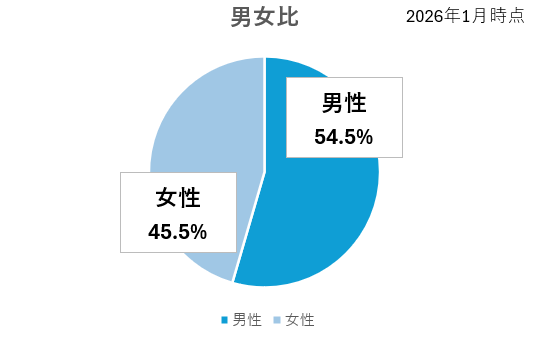 現在、IBJで婚活を行っている会員の男女比率は、女性54.5%、男性45.5%です。(2026年1月)