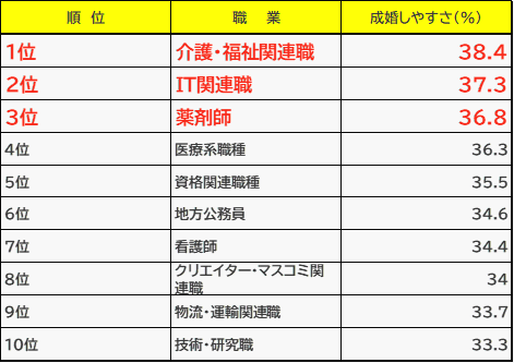 女性の職業別成婚率では、介護・福祉関連職が最も高くなりましたが、男性ほど職業による成婚率の影響は受けにくいことが分かります。